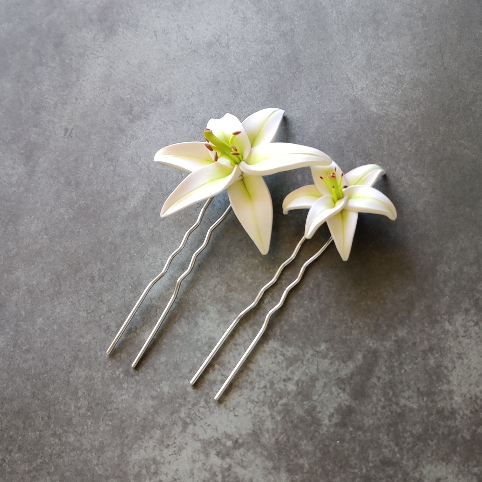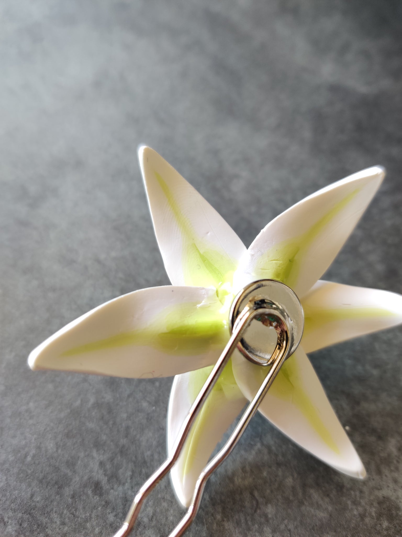 The white lily symbolized purity and rebirth. This makes it a very common flower choice for weddings and ceremonies. This beautiful hair piece will make the perfect focal point for your special occasion look. This single white lily is made entirely of polymer clay which has been baked on to the bezel of the hair pin itself. The underside of the clip has been reinforced with clear UV resin. The resin is visible in the crevasses between a few of the petals and looks like water. The resin reinforcing is not readily visibly while in use.