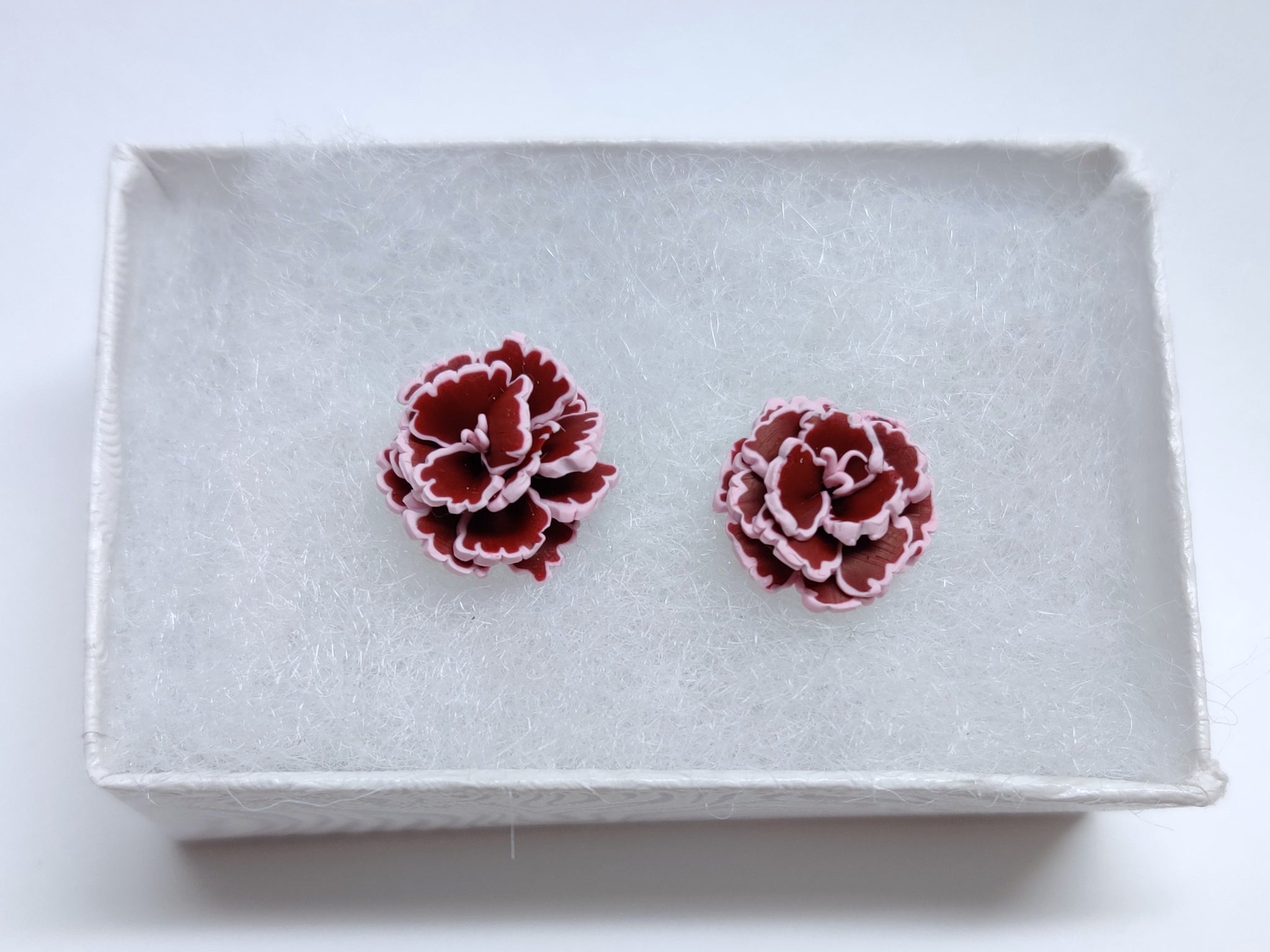 These carnation earrings are a perfect gift for a gardener or flower lover for Valentine's Day. The deep red edged in pale pink along with the flower shape is based off of border carnations commonly grown in gardens. Best of all, they are metal free and safe for those with metal allergies!