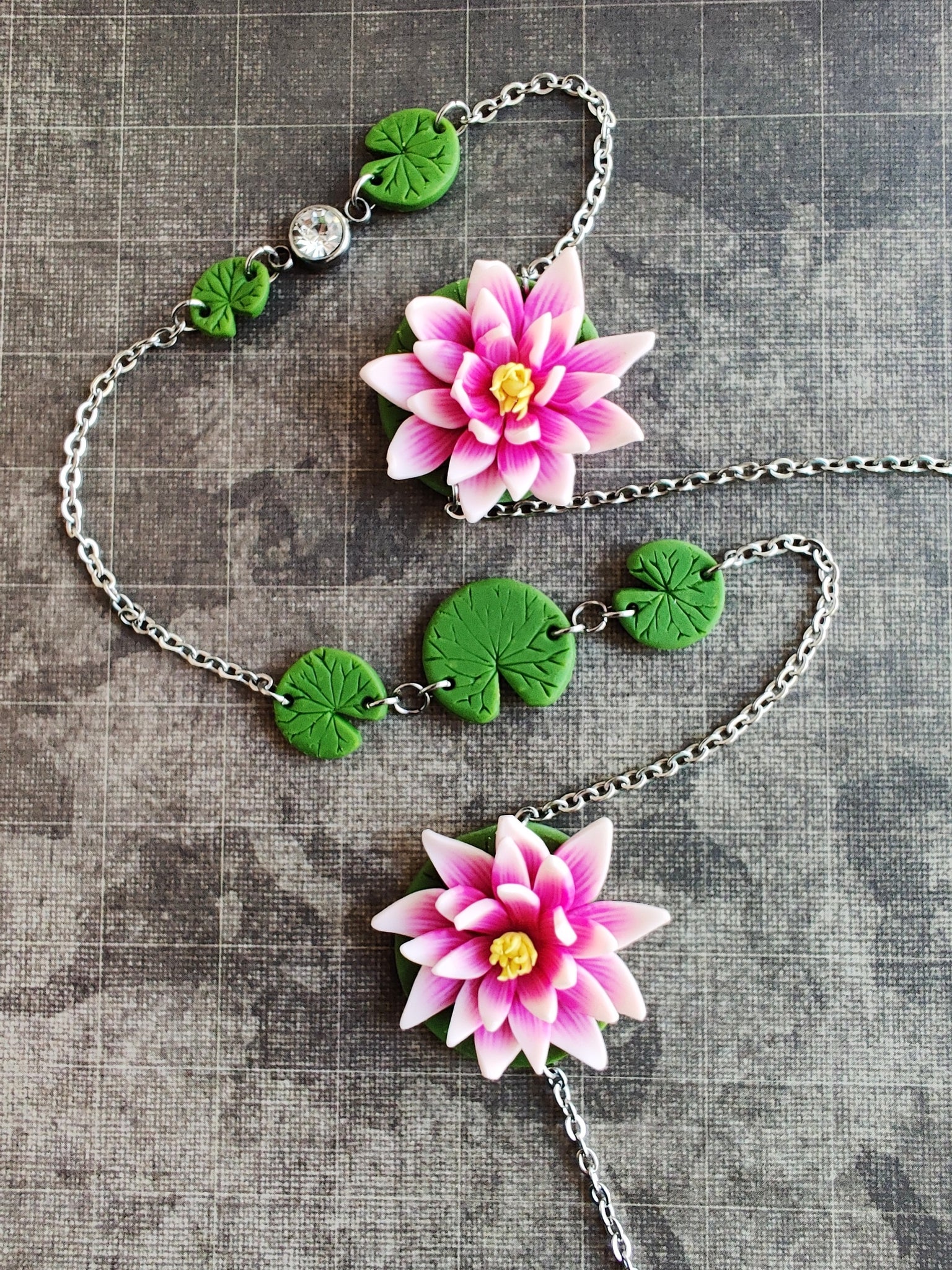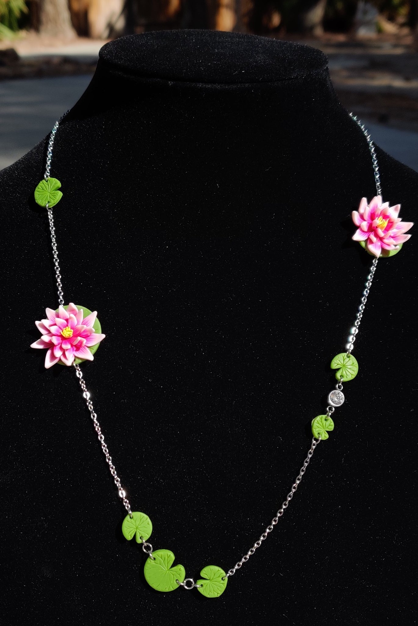 Add a splash of color to your jewelry collection with this unique pink waterlily necklace. The necklace is handmade using polymer clay and stainless steel. Stainless steel is a hypoallergenic metal for most individuals. Necklaces are limited addition and may or may not be restocked.