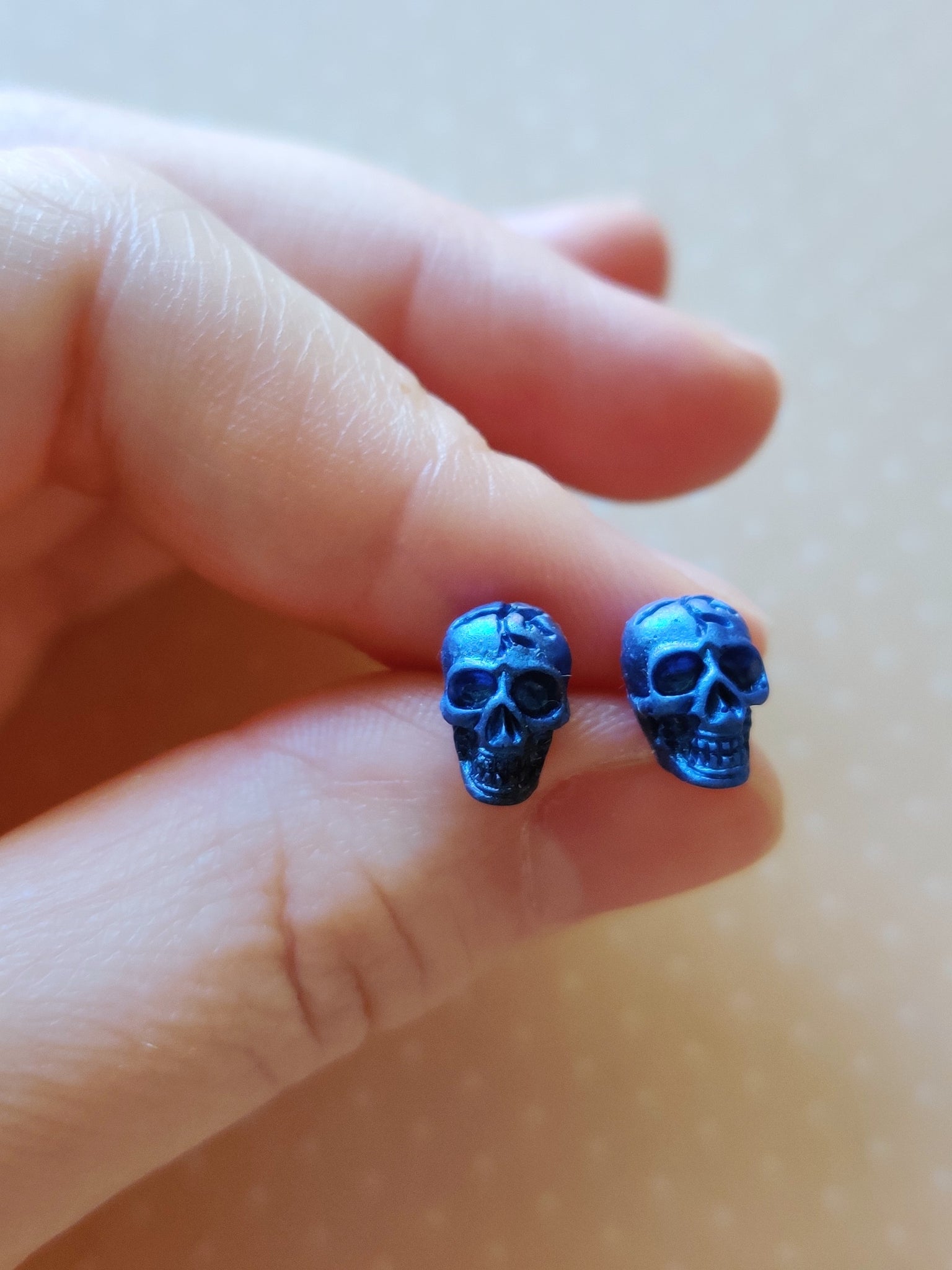 A close of picture of metallic  sapphire colored skull earrings attached to plastic posts.