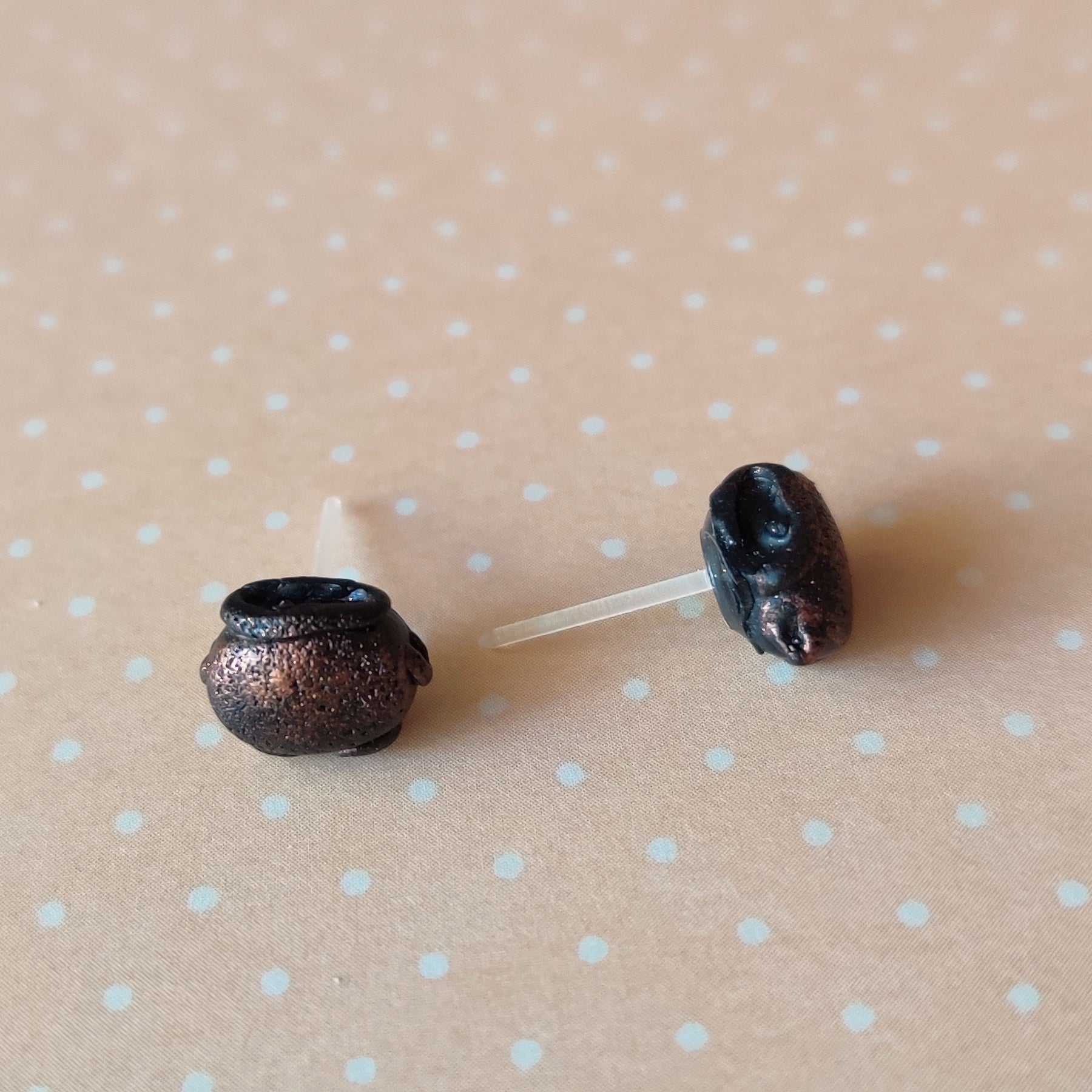 One pair miniature cauldron Halloween stud earrings on plastic posts.